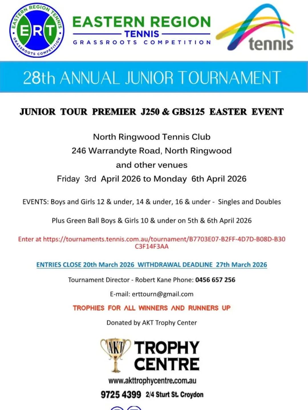 WINTER 2026 JUNIOR COMPETITION REGISTRATIONS ERT Winter Season Dates: Early May - end of August There is no competition play over public or school holidays. Entries Close: 9th March General Information: Donvale Tennis Club (DTC) participate in the Eastern Region Tennis Association Junior Competition (ERT). DTC competes on Saturday and Sunday mornings, ERT is a team...