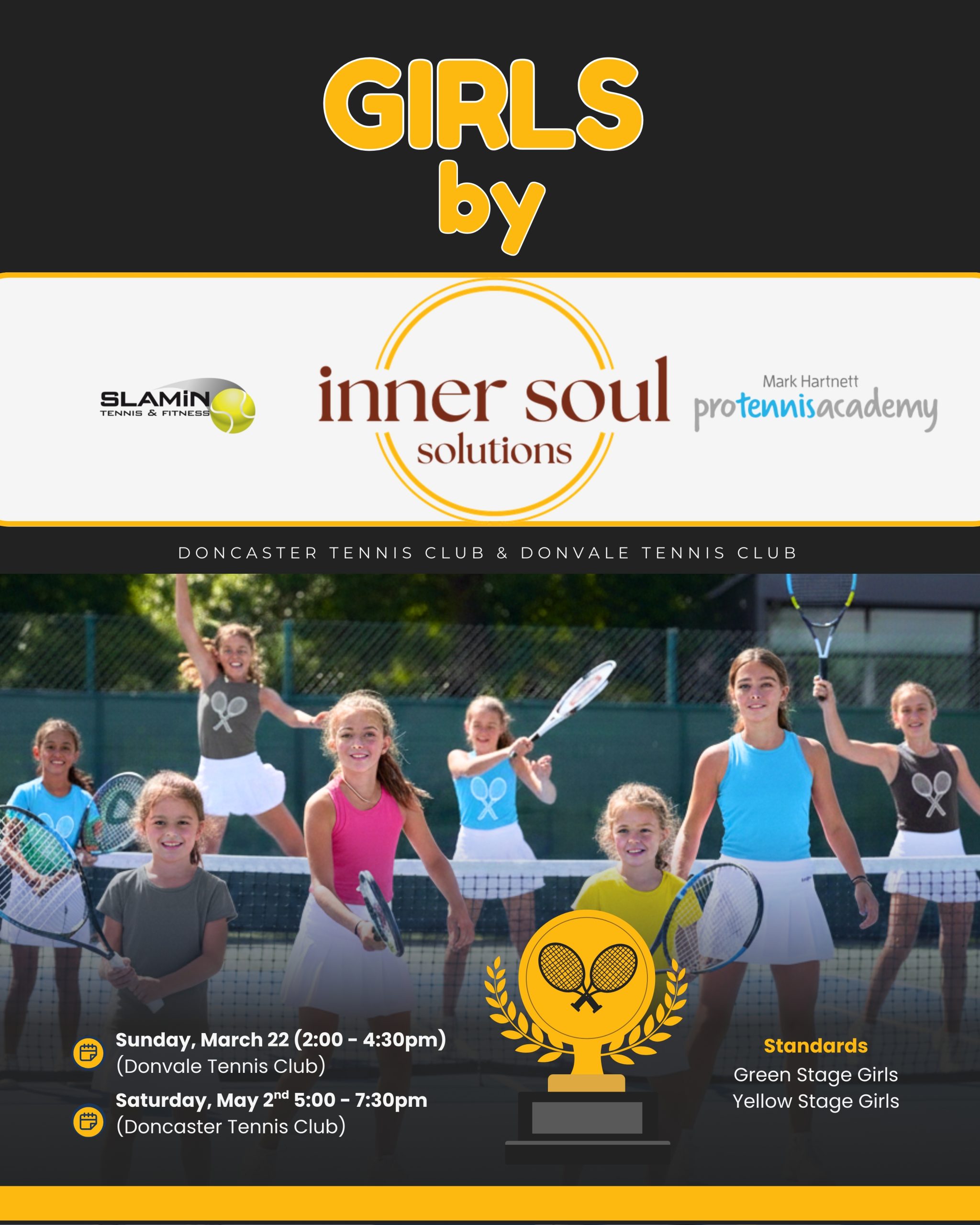 Girls by INNER SOUL SOLUTIONS We’re excited to announce a brand-new opportunity for our competitive girls — the Girls Match Play Series sponsored by Inner Soul Solutions. This initiative has been created through a collaboration between Lisa Hartnett, Head Coach of Donvale Tennis Club, and Vicky Lee, Head Coach of Doncaster Tennis Club. Together, we are creating a girls-only...
